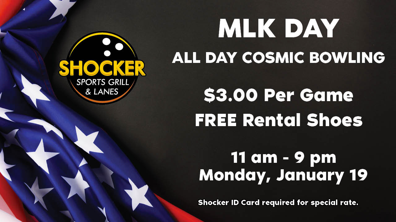 Visit the Shocker Sports Grill and Lanes on Monday, Jan. 19, for all day cosmic bowling. Grab your friends and bowl from 11 a.m.-9 p.m. for just $3 per game, per person, and FREE rental shoes. Shocker ID card required for special rate.