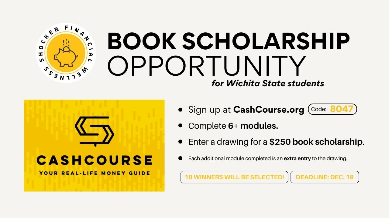 CashCourse is a financial literacy website for students. Sign up using the code: 8047. Complete at least six modules to be entered in a drawing for a $250 book scholarship. Each additional module completed is an extra entry to the drawing. Ten winners will be selected. The deadline to complete the modules is Friday, Dec. 19.