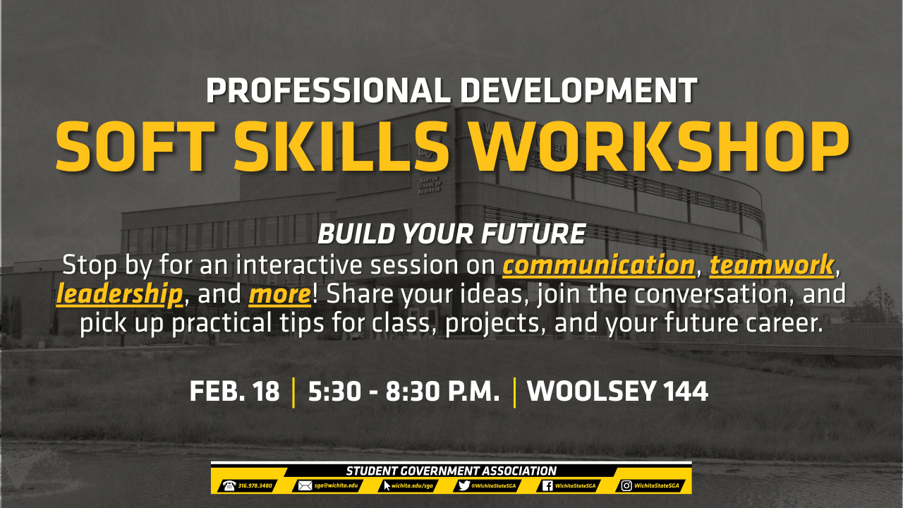 Build the skills employers are looking for at our SGA Professional Development Soft Skills Workshop. This workshop is open to students looking to grow personally and professionally. Join us on Wednesday, Feb. 18 from 5:30–8:30 p.m. in Woolsey 144 to strengthen your communication, teamwork, and leadership abilities while gaining tools to support your future career success. Connect with professionals from around the Wichita area as they share their expertise and provide opportunities to network and build meaningful connections. Free food provided. Open to students looking to grow personally and professionally.