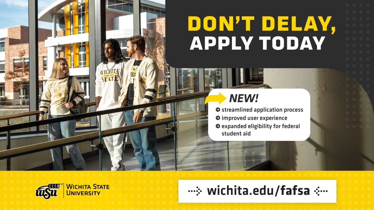 Don't delay, apply for the FAFSA today. The new application is streamlined, with an improved user experience, and expanded eligibility for federal student aid. Visit wichita.edu/fafsa for details and to apply.