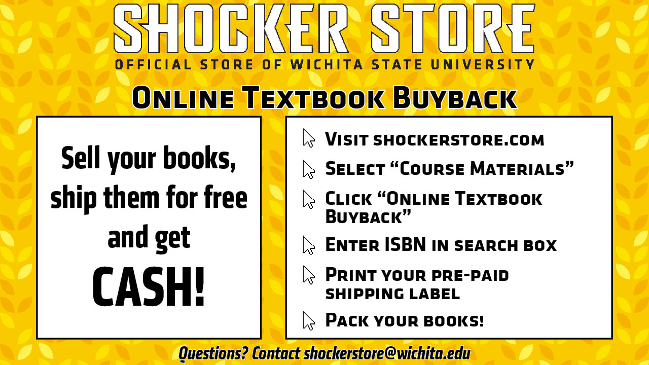 Want to earn some cash for textbooks you no longer need? Participate in the Online Textbook Buyback program. You can sell your books, ship them for free and get cash. If you have questions, email shockerstore@wichita.edu. For more information, visit shockerstore.com