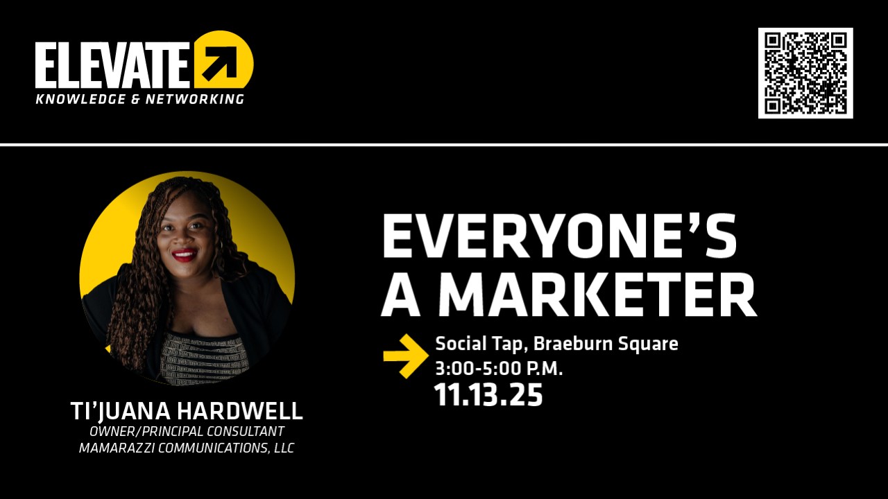 Ti'Juana Hardwell, owner and principal consultant for Mamarazzi Communications LLC, will be the guest speaker for the Elevate Knowledge and Networking Speaker Series on Thursday, Nov. 13. Join the WSU Foundation and Alumni Engagement for an engaging hour of networking beginning at 3 p.m., followed by a presentation titled "Everyone's a Marketer" at 4 p.m. Appetizers and a drink are included with the purchase of a ticket.