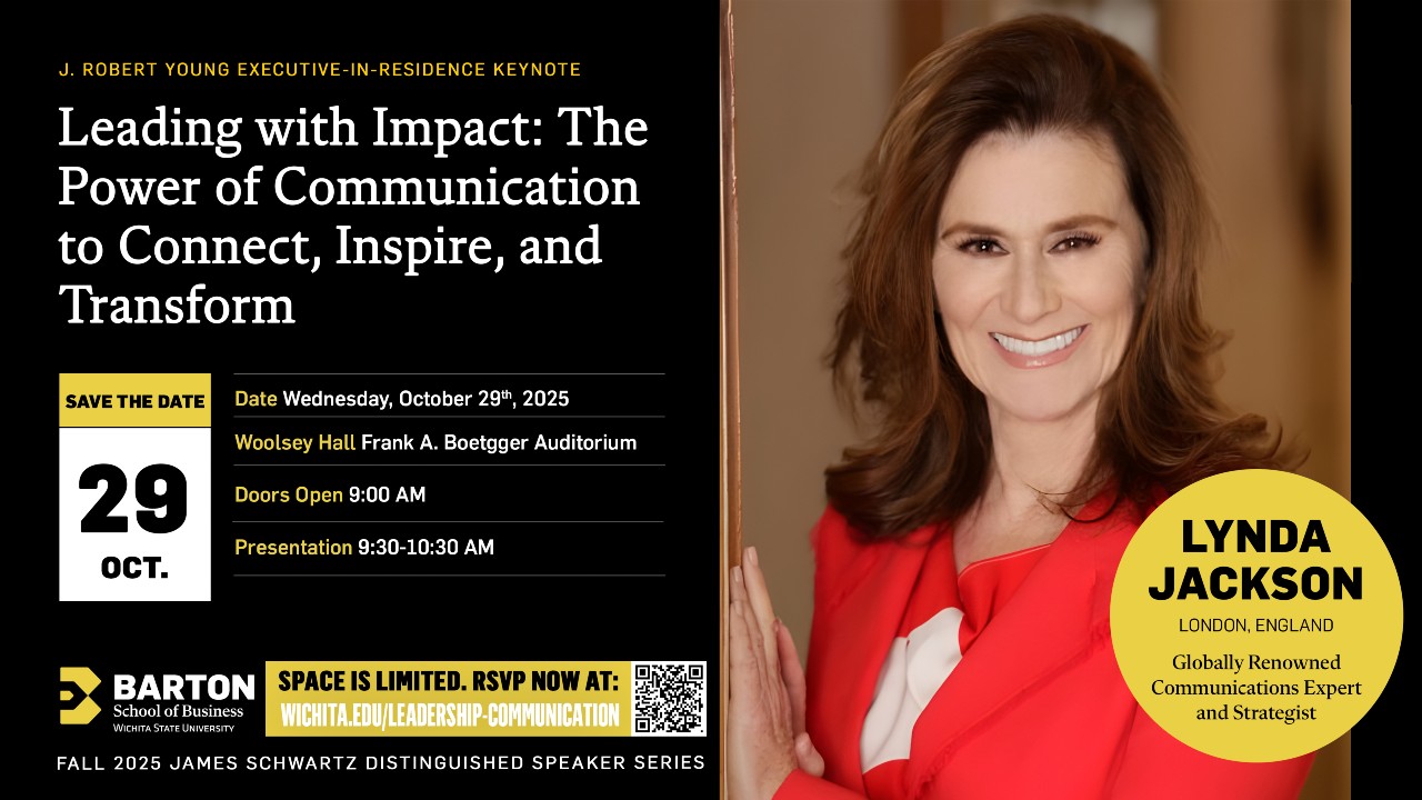 Lynda Jackson, global communications strategist, organizational psychologist and speechwriter, and the Barton School of Business fall 2025 J. Robert Young Executive-in-Residence, will deliver a keynote presentation as part of the James Schwartz Distinguished Speaker Series. Her presentation, “Leading with Impact: The Power of Communication to Connect, Inspire, and Transform,” will highlight how leaders can harness communication to drive change, inspire teams and transform organizations. The keynote event is at 9:30 a.m. on Wednesday, Oct. 29 in 110 Woolsey Hall, Frank A. Boettger Auditorium. Doors open at 9 a.m. The event is free and open to the public. RSVP at wichita.edu/executive-in-residence-keynote.
