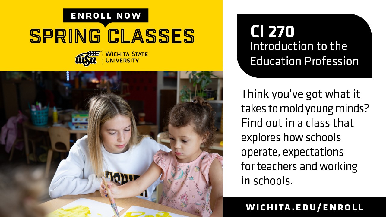(CI 270) Think you’ve got what it takes to mold young minds? Find out in a class that explores how schools operate, expectations for teachers and working in schools. Visit wichita.edu/enroll