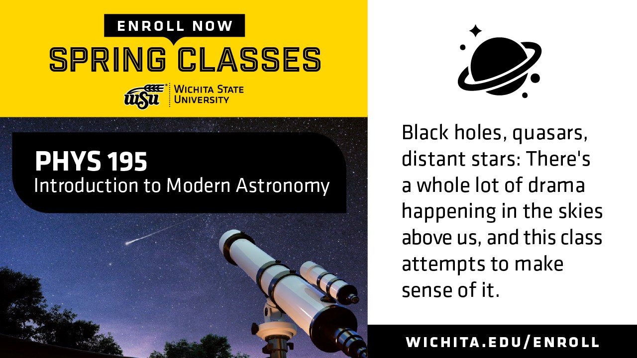 (PHYS 195) Black holes, quasars, distant stars: There's a whole lot of drama happening in the skies above us, and this class attempts to make sense of it. Visit wichita.edu/enroll.