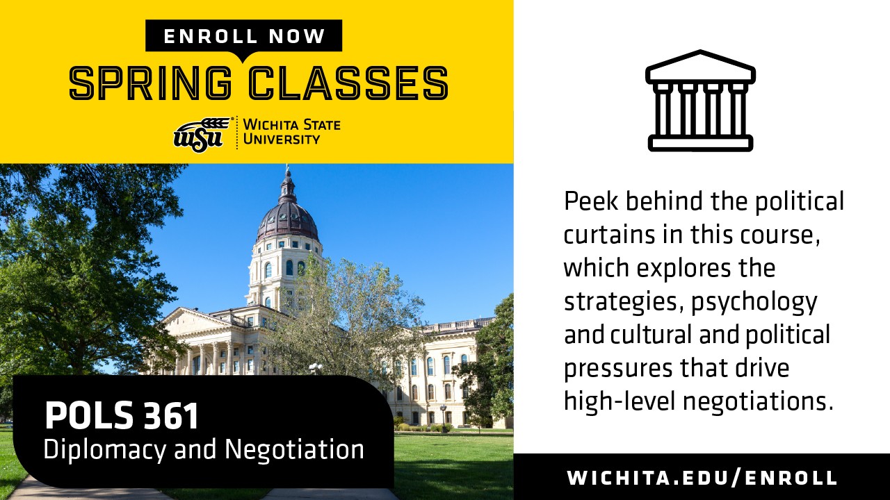 (POLS 361) Peek behind the political curtains in this course, which explores the strategies, psychology and cultural and political pressures that drive high-level negotiations. Visit wichita.edu/enroll.