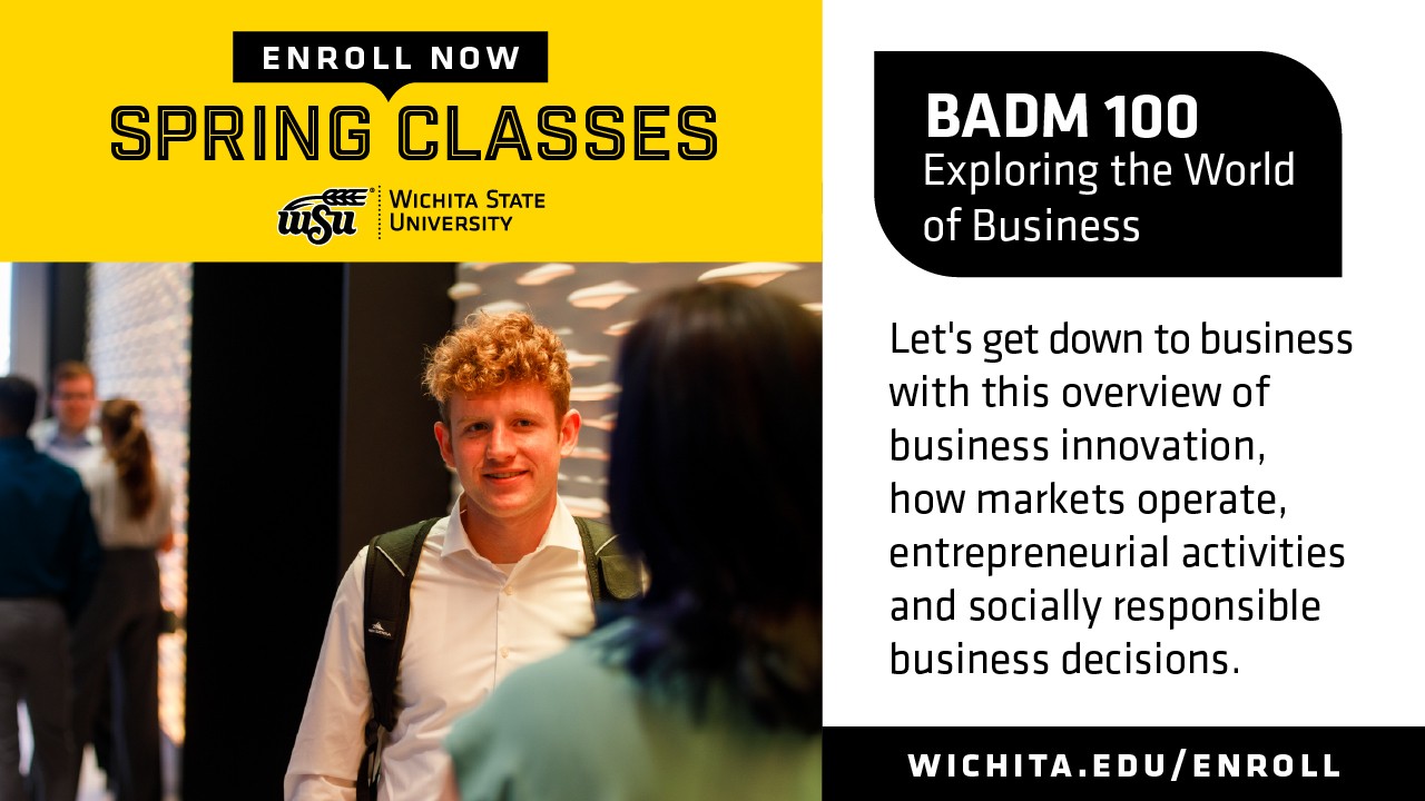 (BADM 100) Let's get down to business with this overview of business innovation, how markets operate, entrepreneurial activities and socially responsible business decisions. Visit wichita.edu/enroll