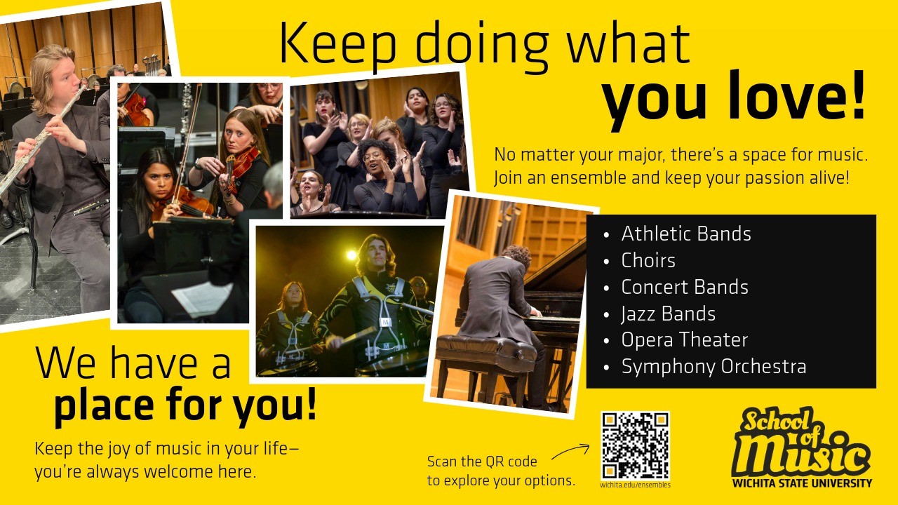 You don’t have to be a music major to make music at Wichita State University. Students from across campus are invited to sing, play and perform in School of Music ensembles that welcome participants from every academic discipline. Whether music has been part of your life for years or something you are ready to return to, there is a place for you here. Non-music majors can participate in concert bands, athletic bands, choirs, jazz bands, opera theater and the Symphony Orchestra. All ensembles offer 0-credit options, allowing students to participate without increasing their tuition or academic load. Making music can help manage stress, build community and keep creativity central to your college experience. No matter your major, you belong in music at Wichita State. Explore ensemble options at wichita.edu/ensembles.