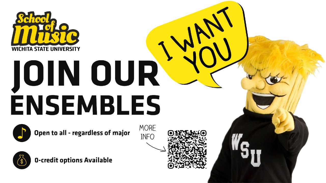 🎶 Play Your Part—Join a WSU Ensemble. 💛🖤 Looking to keep music in your life while at Wichita State? Join one of our many outstanding School of Music ensembles. There’s a place for every instrument, voice, and experience level, from concert bands and choirs to jazz and orchestra. 🎵 Open to all students, regardless of major. 📝 0-credit options available for those who want to participate without the pressure of a grade or the added tuition. 🎼 Auditions happen the week before classes begin. Whether you're looking to perform at the highest level or want to stay connected to music while pursuing another major, we welcome you to our vibrant musical community. Ensemble participation builds friendships, enhances your college experience, and fosters creativity and collaboration. Visit wichita.edu/ensembles to learn more. We want YOU to make music with us.
