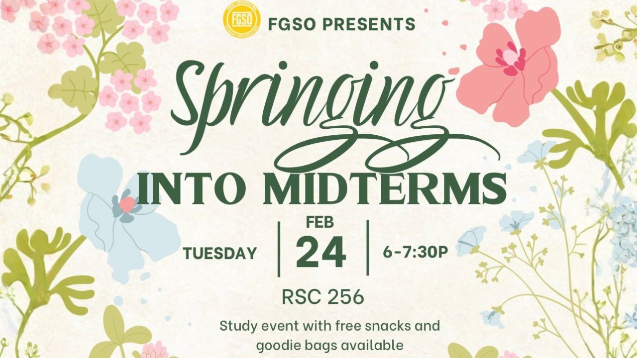 The First Generation Student Organization welcomes you to spring into midterms. During this busy midterms season, visit FGSO for a relaxing study night with snacks and goodie bags to help you ace your test. Don't miss out, we'd love to have you. Tuesday, Feb. 24, 6 p.m. – 7:30 p.m. in RSC 256. See you there.