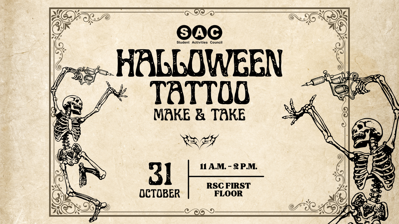 This Halloween, come get an airbrushed tattoo with the SAC on the first floor of the RSC on Friday, Oct. 31 from 11AM-2PM. Be sure to bring your friends, snaps some photos, and tag the SAC on Instagram telling us about your experience. This event is free for students.