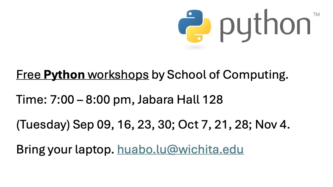 WSU students, staff and faculty can attend for free. The workshops are 7 to 8 p.m. in Jabara Hall 128 on the following days: Tuesdays, Sept. 9, 16, 23, 30; Tuesdays, Oct. 7, 21, 28; and Tuesday, Nov. 4. The course will cover different topics each day. Bring your laptop. We do coding together. We use Google’s Colab. Workshop coach: Huabo Lu Proudly served by the School of Computing.