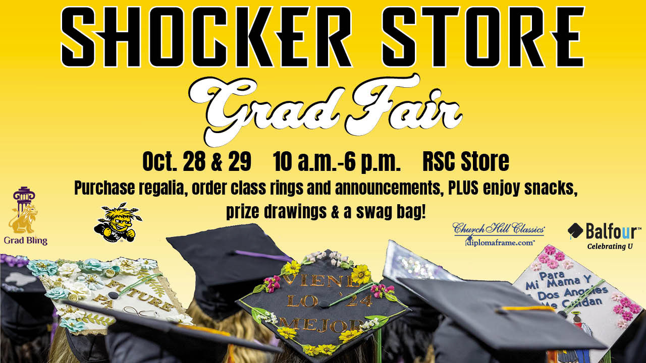 Graduating Shockers, visit the Shocker Store for their Grad Fair. Swing by the RSC store from 10 a.m.-6 p.m. on Tuesday, Oct. 28 and Wednesday, Oct. 29 to purchase regalia, order class rings and announcements, enjoy snacks and prize giveaways and more.