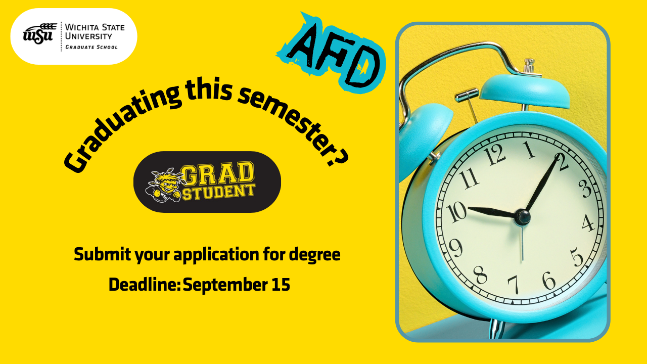 Submit your graduate student application for degree by Monday, Sept. 15. For questions, email the Graduate School at wsugradschool@wichita.edu.
