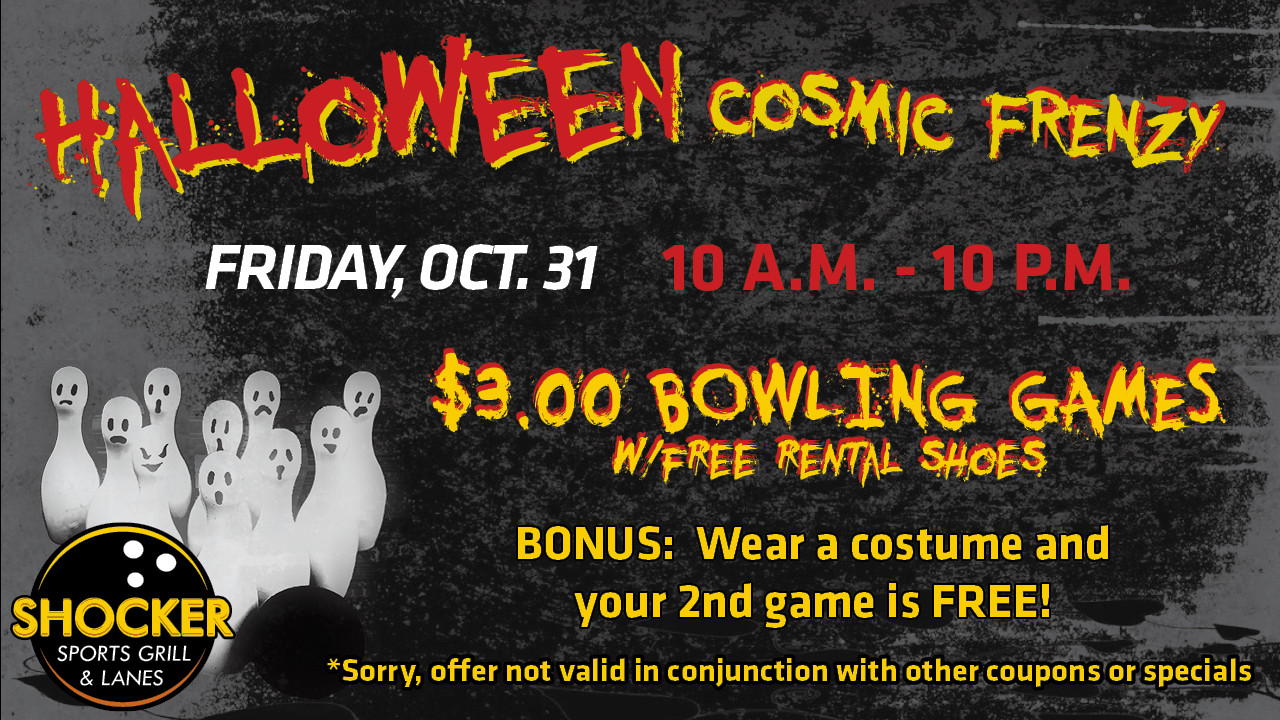 Visit the Shocker Sports Grill and Lanes on Friday, Oct. 31, from 10 a.m.-10 p.m. for a Halloween Cosmic Frenzy. Enjoy $3 cosmic bowling games with free rental shoes. Bonus- wear a costume and your second game is FREE. Offer not valid with other coupons or specials. Call 316-978-3479 for details. Open to the public.