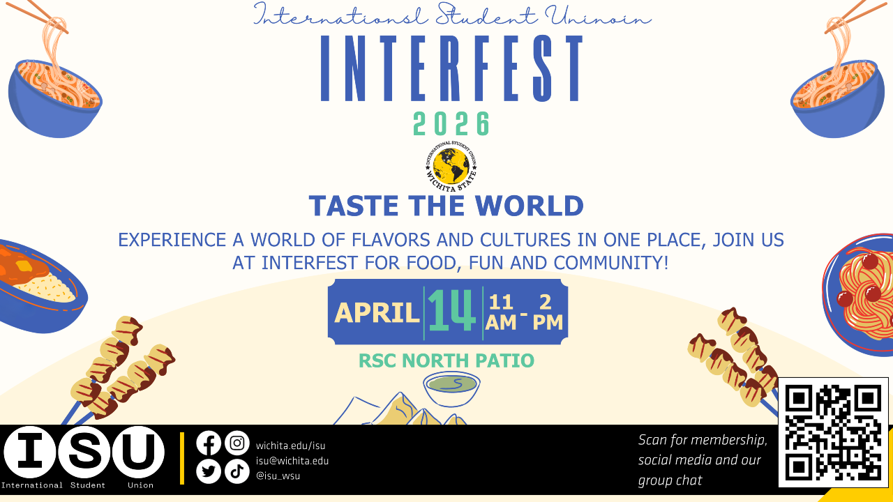 The International Student Union is back with Interfest 2026. Experience a world of flavors and cultures in one place, join ISU at Interfest for food, fun and community. On Tuesday, April 14 from 11 a.m. to 2 p.m.
