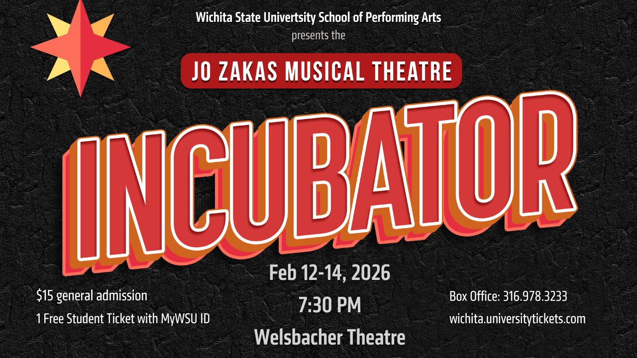 The School of Performing Arts is excited to present PSYCH. as this years Jo Zakas Musical Theatre Incubator. PSYCH. Is a hilarious, 90’s inspired musical retelling of the myth of Cupid and Psyche. When Aphrodite is banished to high school, her schemes to control love spiral into chaos, culminating in a Homecoming night where secrets spill, hearts open, and kindness finally wins. Smart, joyful, and full of pop-culture flair, PSYCH. Is a celebration of love in all its messy magical forms. Join us on Thursday, Feb. 12-14th @ 7:30PM at the Welsbacher Theatre for the staged reading. Tickets: $15 general admission and 1 Free Student Ticket with MyWSU ID Box Office: 316.978.3233 or wichita.universitytickets.com