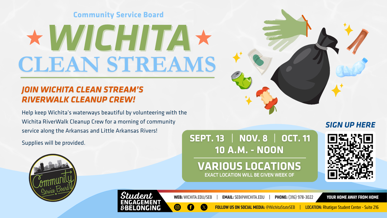 Join the Community Service Board volunteering with Wichita Clean Streams by volunteering for a morning of clean-up around the areas around the Arkansas and Little Arkansas River. Volunteers days will be held on the second Saturday of each month on Saturday, Sept. 13, Saturday, Oct. 11 and Saturday, Nov. 8 from 10:00 a.m.-12:00 p.m. Volunteers will be sent the location of the volunteer meet-up prior to the event. For more information and to sign-up visit our website here: https://wichita.galaxydigital.com/need/detail/?need_id=1093357 For more questions email CSB@wichita.edu or call 316-978-7016.