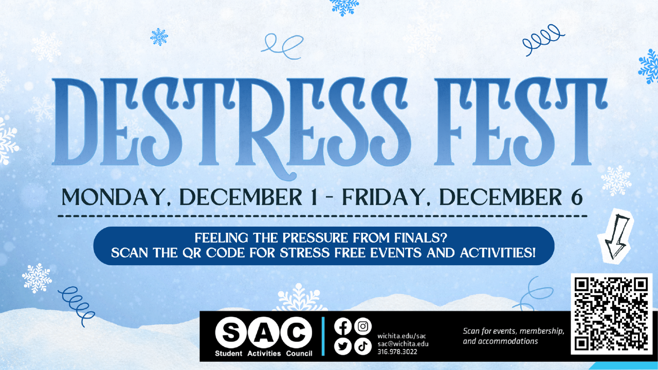 Feeling the pressure for finals? Join the SAC and partner organizations to de-stress and study up for your exams. De-Stress Fest will run from Monday, Dec. 1 to Friday Friday, Dec. 5. For more information, please visit wichita.edu/destress, or email us at sac@wichita.edu. We look forward to seeing you at our events.
