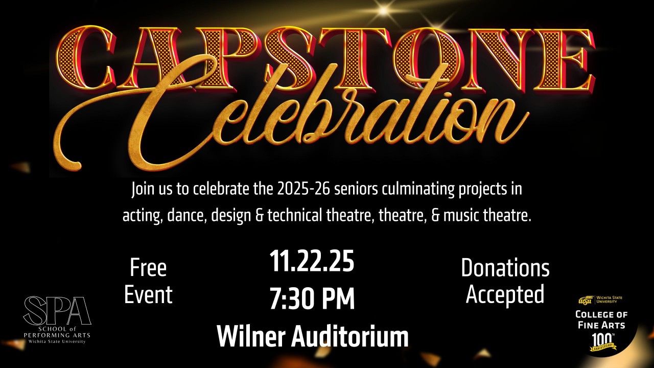 Join the School of Performing Arts as they celebrate the 2025–26 seniors and their capstone projects in acting, dance, design and technical theatre, theatre, and music theatre. The event is free to attend, with donations accepted. It takes place on November twenty-second at seven-thirty in the evening in Wilner Auditorium.