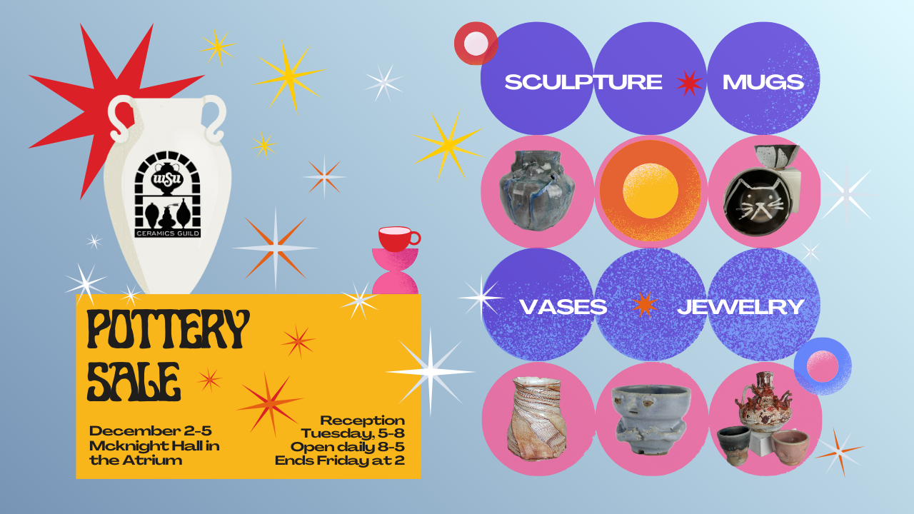 Join the WSU Ceramics Guild for their annual holiday sale. In the McKnight Art Center's atrium on Tuesday, Dec. 2 from 5pm-8pm, we will have our opening reception. Come meet some of the artists, buy gifts for the holidays, and have some light refreshments. The sale will continue daily on Wednesday, Thursday, and Friday, Dec. 5 through the 5th from 8am-5pm, except for Friday when we close at 2pm. Support fellow students and artists while shopping local this year. We hope to see you there.