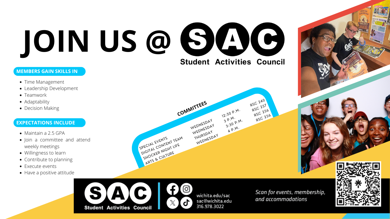 Interested in event planning, building connections, applying and learning leadership skills, and making memories. Join a committee at SAC, at any point throughout the semester. You can join by attending a meeting, filling out our member interest form, or asking any SAC member you know. Member expectations include maintaining a 2.5 GPA, joining a committee and attending weekly meetings, contributing to the planning and execution of events, having a positive attitude, and a willingness to learn. Our committees include Special Events, Digital Content Creation Team, Shocker Night Life, and Arts and Culture. For additional information, please email sac@wichita.edu.