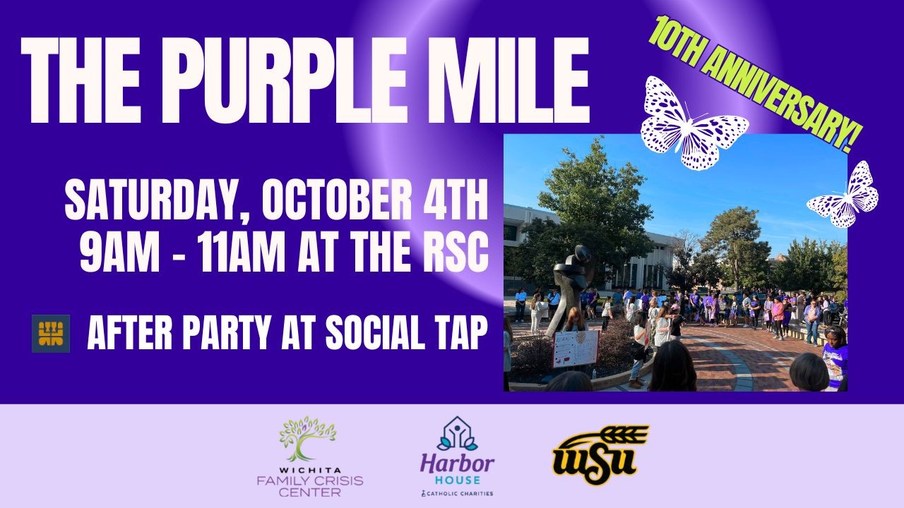 The Purple Mile Annual Domestic Violence Memorial and Awareness Walk and Social Service Fair is Saturday, Oct. 4 from 9 to 11 a.m. on the WSU Campus, North side of RSC. For our 10th anniversary, join us in remembering those impacted by dating/domestic violence in our community over the last decade, learn about resources, and connect with others over light refreshments and art. For those who wish to participate, a one mile walk on campus follows this year's guest speakers. Join us afterward at Social Tap Drinkery in Braeburn Square. Social Tap is donating 5% of their proceeds to Wichita Family Crisis Center and Harbor House. This event is hosted by the Midwest Criminal Justice Institute, WSU HOPE Services, Wichita Family Crisis Center, and Harbor House.