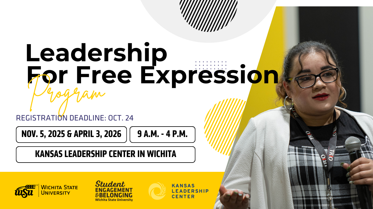 Registration deadline: Oct. 24. Event is Nov. 5 and April 3, from 9 a.m. to 4 p.m., at the Kansas Leadership Center in Wichita. https://wichita.edu/leadershipforfreeexpression/. Questions? Email Gabriel Fonseca at gabriel.fonseca@wichita.edu.