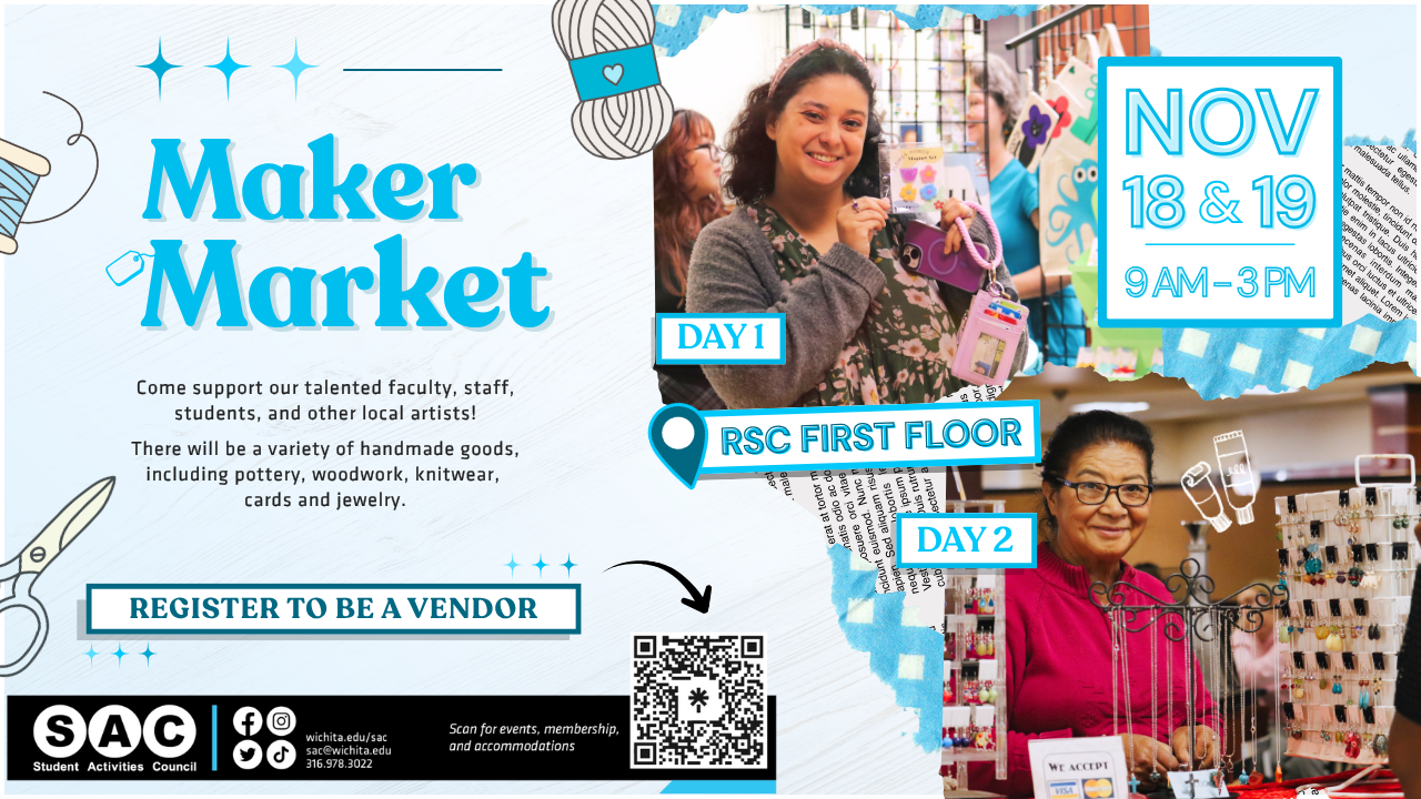 Come support our talented faculty, staff, students, and other local artists by purchasing a variety of handmade goods, including pottery, woodwork, knitwear, cards, and jewelry. This two-day event will be from 9 a.m. to 3 p.m. on Tuesday, Nov. 18 and Wednesday, Nov. 19 in the RSC 1st floor. You can register to be a vendor by going to wichita.edu/makermarket.
