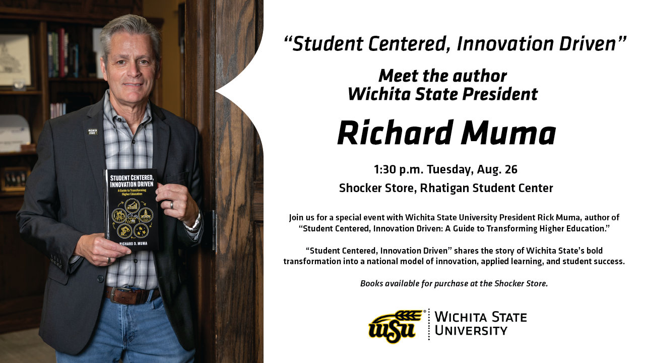 Join us for a special event with Wichita State University President Richard (Rick) Muma, author of "Student Centered, Innovation Driven: A Guide to Transforming Higher Education." "Student Centered, Innovation Driven" shares the story of Wichita State's bold transformation into a national model of innovation, applied learning, and student success. This event will be at 1:30 pm on Tuesday, August 26th at the Shocker Store in the Rhatigan Student Center. Books are available for purchase at the Shocker Store.