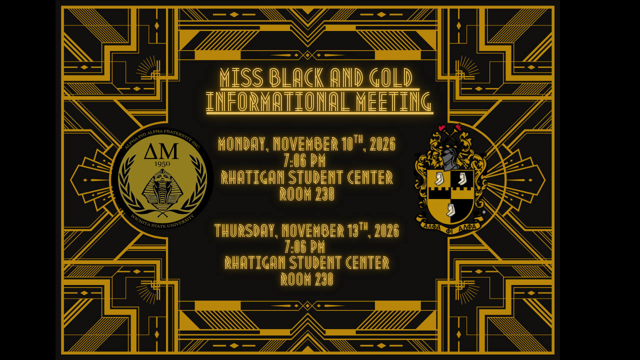 Calling all ladies of Wichita State University The Brothers of the Delta Mu chapter of Alpha Phi Alpha Fraternity, Inc. are proud to announce that we re having our informational sessions for our Miss Black and Gold Scholarship Pageant on Monday, Nov. 10 and 13th in RSC 238 at 7:06 pm. This is an opportunity to learn about the pageant process and hear testimonials from our current Miss Black and Gold Royal Court. See you there.