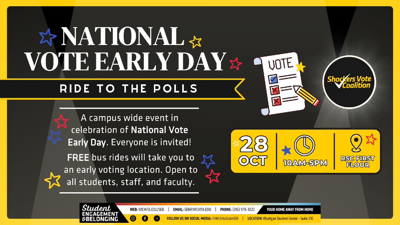 Tuesday, Oct. 28, is National Vote Early Day. In celebration of this national holiday the Shockers Vote Coalition will providing rides to an early voting location to vote. Free bus rides will be available throughout the day to give you rides to the polls beginning at 10:00 a.m.-4:00 p.m. Meet us on the first floor of the RSC to learn more about voting early and to catch your vote early. For more information email us at civicengagement@wichita.edu or call 316-978-7016.