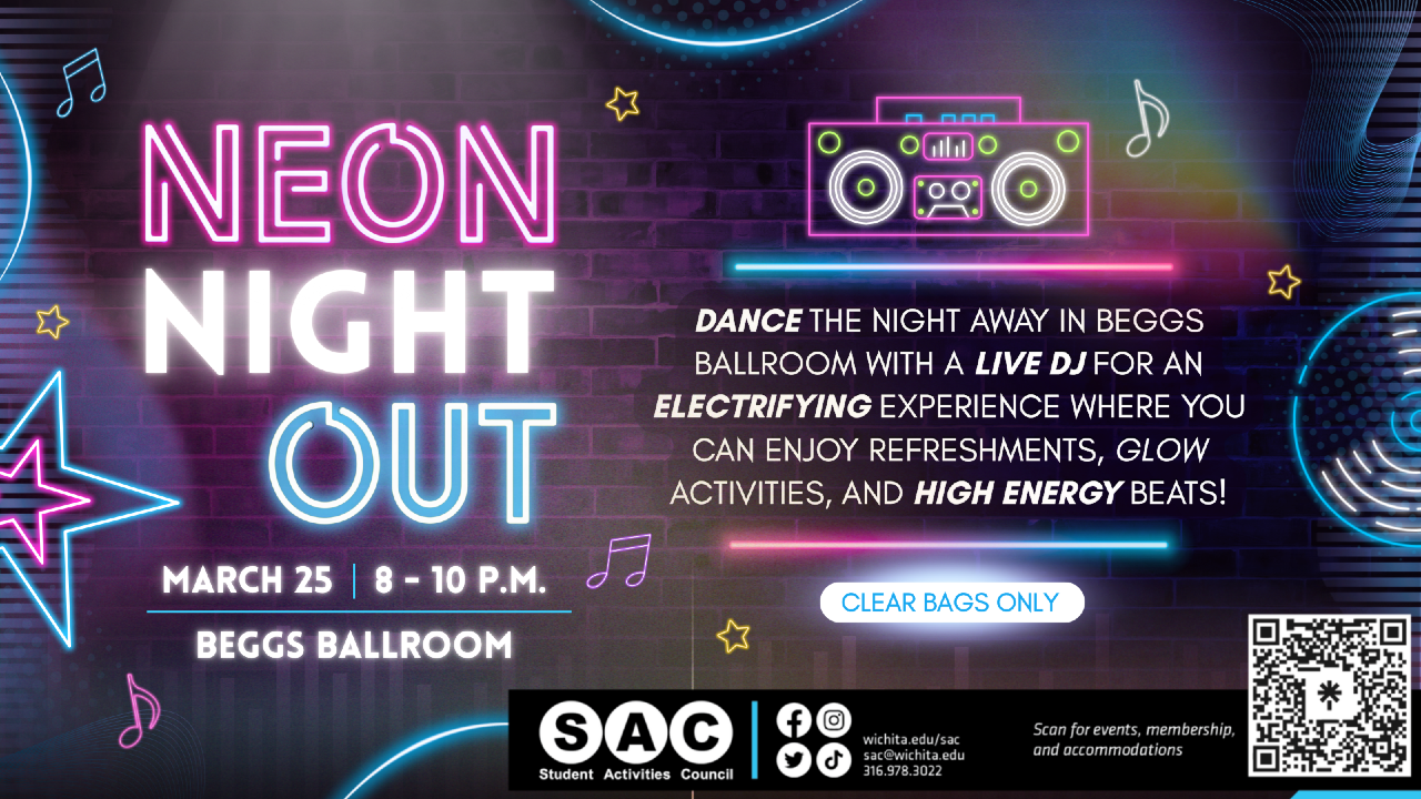 Neon Night Out- glow dance party on Wednesday, March 25 at 8pm to 10pm in Beggs Ballroom in the Rhatigan Student Center. Dance the night away in Beggs Ballroom with a live DJ for an electrifying experience where you can enjoy refreshments, glow activities and high energy beats. Clear Bags only at this event.