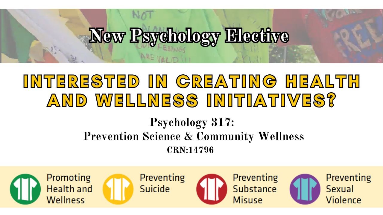 Interested in creating health and wellness initiatives? Psychology 317: Prevention Sciences and Community Wellness, CRN: 14796.