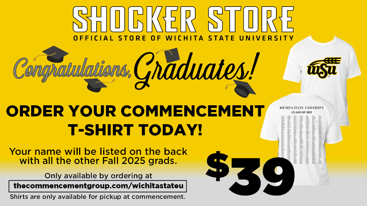Graduating Shockers, order your commencement t-shirt today. Your name will be listed on the back with all the other Fall 2025 grads. These are only available by ordering online in advance. Shirts will be available for pickup at commencement. Order at thecommencementgroup.com/wichitastateu