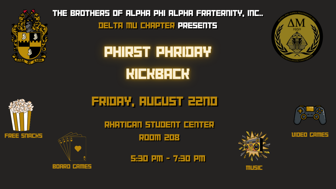 Come start the new school year with a bang with the Brothers of Delta Mu. Our Phirst Phriday Kickback is a chance to unwind from first week stress and connect with your fellow students. Come by and play some games, eat some snacks and enjoy the vibes. 5:30 to 7:30 p.m. on Friday, Aug. 22, at the Rhatigan Student Center, Room 208.