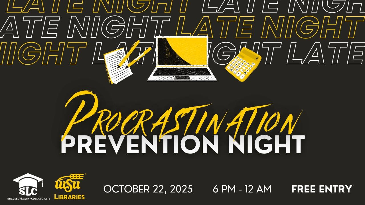 Feeling the pressure? Join us for Procrastination Prevention Night at Ablah Library on Wednesday, Oct. 22 from 6 p.m. to midnight. We’ll have workshops, tutoring, and more to help you tackle assignments and stay on track — plus arts and crafts, games, and food to reduce stress as deadlines approach.