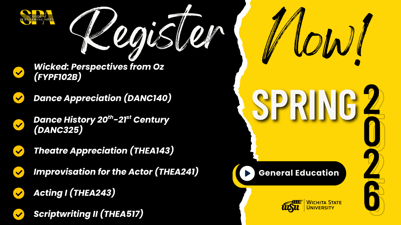 Registration is open for Spring 2026, and the School of Performing Arts has a great lineup of classes. You can explore Wicked: Perspectives from Oz, take Dance Appreciation, or dive into Dance History from the twentieth through the twenty-first century. There are also options like Theatre Appreciation, Improvisation for the Actor, Acting One, and Scriptwriting Two. Many of these courses count toward general education, so they’re a good fit whether you’re majoring in the arts or just looking for something creative and engaging next semester.
