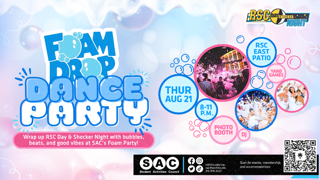 Dive into the new semester with bubbles, beats and good vibes at the Student Activities Council's (SAC) Foam Party. This grand finale event to wrap up RSC Day and Shocker Night will offer a DJ, foam cannons, an indoor photo booth and yard games to welcome students back to campus start the year off with great energy. So wear something you don't mind getting wet and get ready to party under the stars. This event is Thursday, Aug. 21 from 8 to 11 p.m. on the RSC East Patio. It is recommended to only bring necessary items and leave bags at home as there will not be a place to store personal items at this event. The Student Activities Council, Student Engagement and Belonging office and the Rhatigan Student Center are not responsible or liable for any lost or stolen personal items.