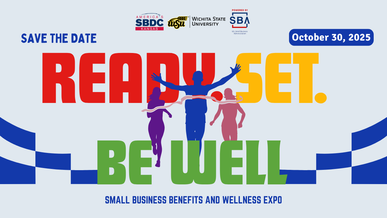 Save the Date: Ready. Set. Be Well: Small Business Benefits and Wellness Expo. Thursday, Oct. 30 hosted by the Kansas Small Business Development Center at Wichita State University.