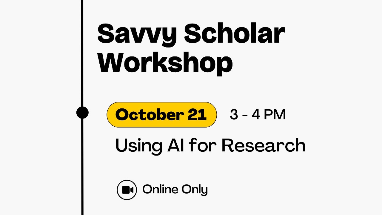 Join us on Tuesday, Oct. 21, from 3:00 pm to 4:00 pm online for a workshop to help you make informed academic decisions by learning when AI can strengthen your assignments—and when it can’t. There is no cost to attend. You’ll learn how to use AI to speed up research while spotting its limitations. RSVP Here: https://libraries.wichita.edu/savvyscholar
