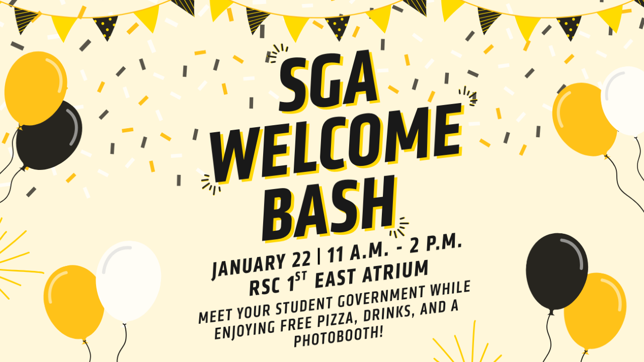 Kick off the spring semester at the SGA Welcome Bash on Thursday, Jan. 22 from 11:00 a.m. to 2:00 p.m. in the RSC First East Atrium. This indoor welcome event is hosted by the Student Government Association and features free pizza, sodas, and a photo booth with SGA members. Students will have the opportunity to meet SGA Executive Officers, Senators, and Justices while learning more about student government initiatives and upcoming events. The SGA Welcome Bash is a fun, welcoming way to start the semester and connect with your student leaders.