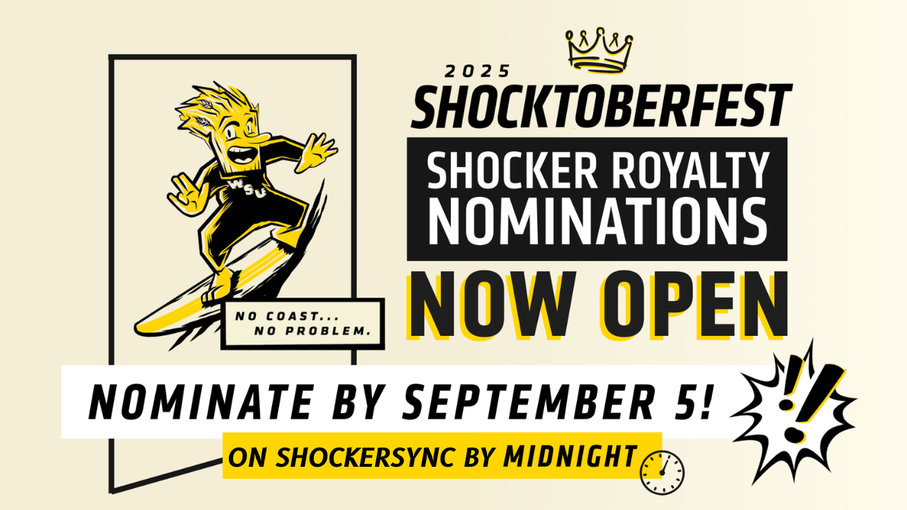 Shocktoberfest, Wichita State's annual celebration of spirit and pride, is Monday, Sept. 29 – Saturday, Oct. 4. Shocker Royalty nominations will close on Friday, Sept. 5 at midnight. Submit your nomination on Shocker Sync.
