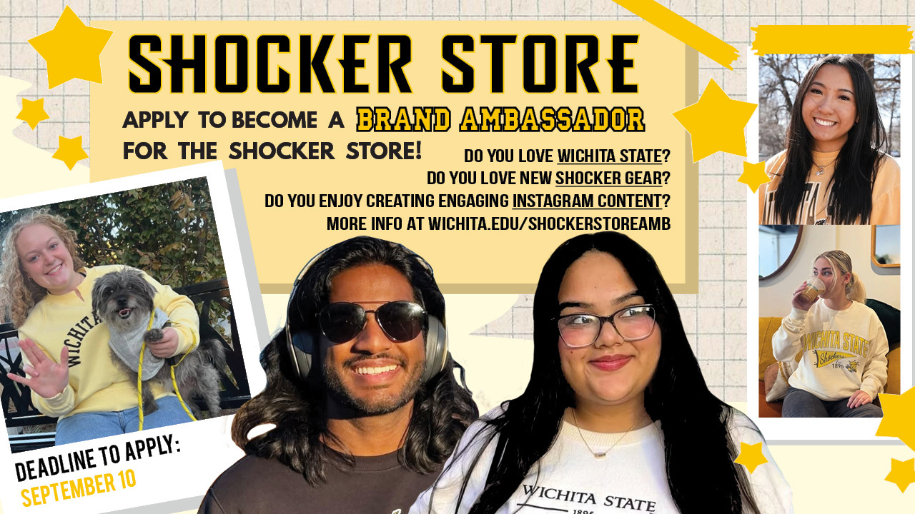 Students, do you love Wichita State? Do you love new Shocker gear? Do you enjoy creating engaging Instagram content? If so, apply to become a Shocker Store Brand Ambassador. Selected students will work with the Shocker Store to use Instagram and other avenues to increase student knowledge of Shocker Store products, services and more. Bonus- you’ll receive free Shocker merchandise. Deadline to apply is Wednesday, Sept. 10. For more information and to apply, visit wichita.edu/shockerstoreamb.