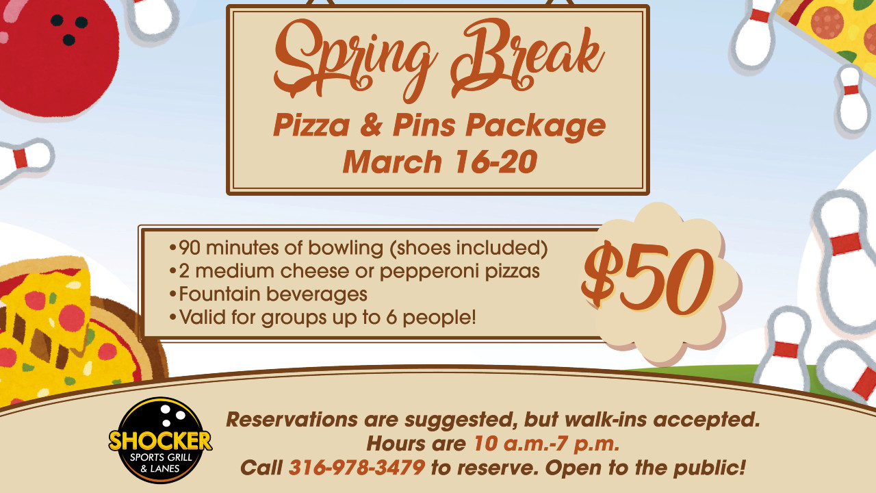 Visit the Shocker Sports Grill and Lanes from Monday, March 16-20 for their Spring Break Pizza and Pins Package. For just $50, the package includes 90 minutes of bowling (shoes included), two medium cheese or pepperoni pizzas and beverages for groups up to 6 people. Reservations are suggested but walk-ins accepted. Hours that week are 10 a.m.-7 p.m. Call 316-978-3479 to reserve. Open to the public.