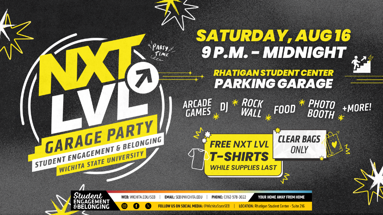The 5th Annual NXT LVL Garage Party is back and bigger than ever on Saturday, Aug. 16 at the Rhatigan Student Center Parking Lot. Get ready for an unforgettable night filled with delicious food, exciting games, live music, and amazing prizes. Be sure to grab your exclusive NXT LVL shirt—available for free while supplies last. This high-energy event is the perfect way to kick off the semester and connect with fellow Shockers. Admission is exclusive to Wichita State students. Please note that no bags or outside food will be permitted; clear bags are accepted.