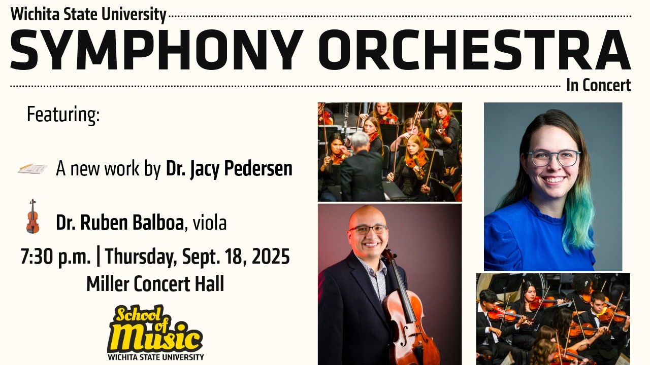 Experience the Wichita State Symphony Orchestra as they premiere a new work by Dr. Jacy Pedersen and feature Dr. Rubén Balboa on viola. 7:30 p.m. Thursday, Sept. 18 Miller Concert Hall Tickets available through the College of Fine Arts Box Office. Current WSU students get one free ticket with their Shocker ID.