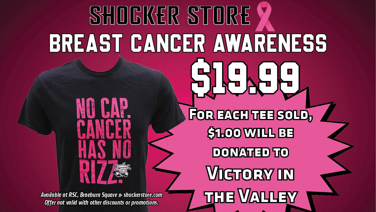 The Shocker Store is selling a new tee in October during Breast Cancer Awareness Month. For each one sold, $1.00 will be donated to Victory in the Valley, who provides support to cancer patients, survivors and their families in the area. The tee is available at both the RSC and Braeburn Square stores and online. This offer is good while supplies last. No discounts accepted on this merchandise.