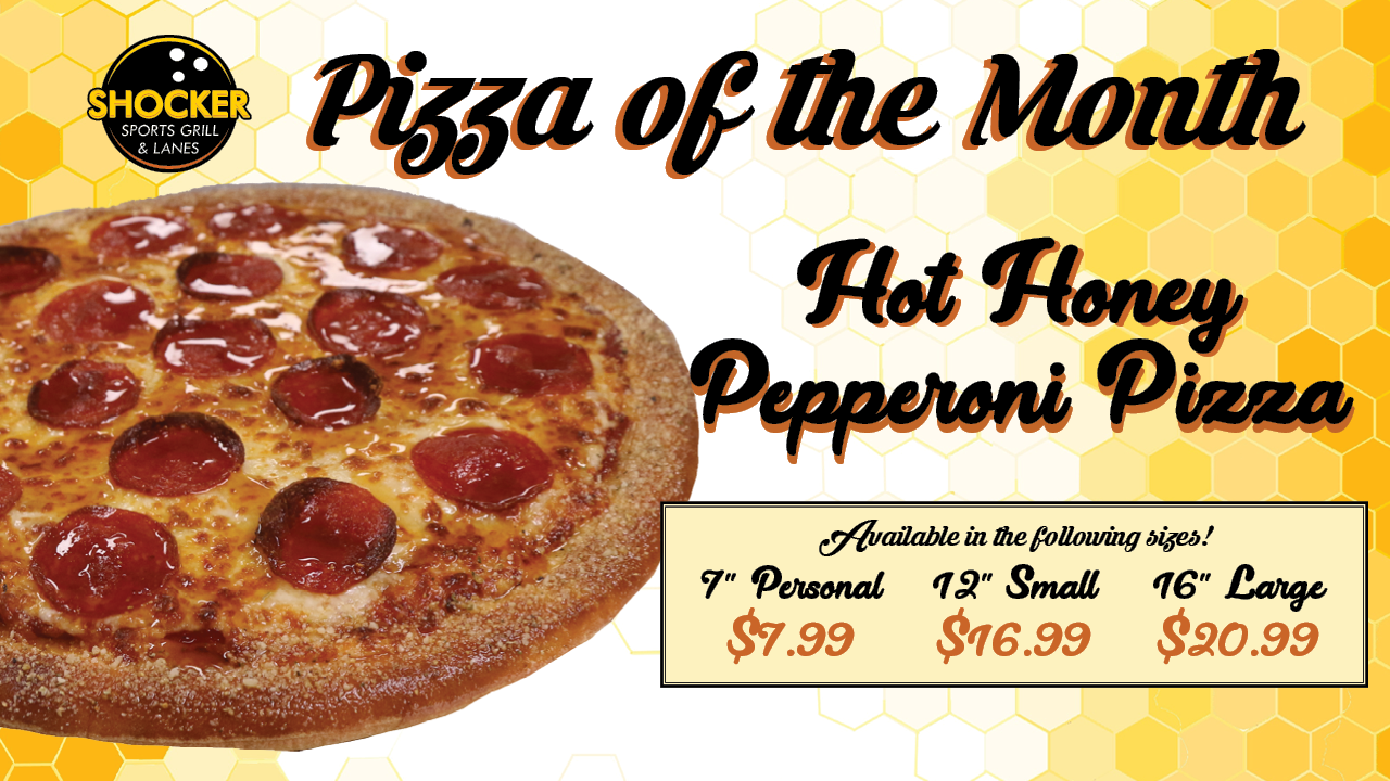 Visit the Shocker Sports Grill and Lanes in August to try the Pizza of the Month, the Hot Honey Pepperoni Pizza. Available in three sizes.