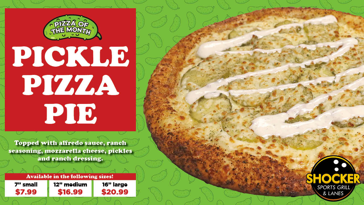 Visit the Shocker Sports Grill and Lanes in November to try the Pizza of the Month, the Pickle Pizza Pie. It’s topped with alfredo sauce, ranch seasoning, cheese, pickles and ranch dressing. Prices are $7.99 for a 7-inch, $16.99 for a 12-inch, and $20.99 for a 16-inch pizza.